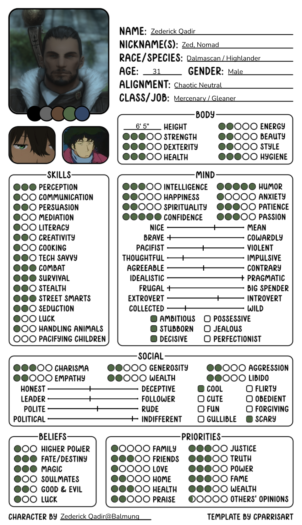 ⌲ Sharlayan Gleaner (Common): An occupation far from what he'd ever believe himself to settle into, gleaning has become much more than his career: it's become his passion. There is no assignment he won't take, and no request he will refuse. Though the thrill of danger exists with some facets of the job, Zed genuinely loves being able to sit, observe, and take in the beauty of nature. He won't shy away from a conversation on his duties or the assignments he's been on recently. It might take a drink or two for him to warm up to you, though.⌲ The Mercenary (Common): Though his job pays quite well, there are always odd jobs here and there. While he would consider his time as a bounty hunter to be over, the occasional posting may catch his eye. Be it relic acquisition, guard duty, or something far more sinister, Zed is always available. For the right compensation, of course.⌲ Virtue and Vice (Common): With a moral compass that doesn't often point north, he does what's right by him. He had grown up with the stories of the Zodiac Braves: he knows the sort of person he wants to be. Even the best, however, will need to blow off steam every now and then. You may find him with a cigarette in one hand, bourbon in the other. All the while, the gil in his pockets flows freely and without a care. That is, until the next morning.⌲ In Search of Alchemy (Intermediate): It's his job to be prepared for any outcome. It's what he tells himself, at least. With each assignment comes new threats, new opportunities; every job means the hours slip by, rest eluding him once more. While he doesn't mind losing his forty winks, he often searches for local alchemists who might have their favored proclivities. Their knowledge of local fauna makes their advice invaluable. If they also know how to mix a strong cup of coffee, that'll do just fine.⌲ The Quiet Life (Intermediate): Grease on his hands, grime on his clothes. Though he loathes to settle down for long periods of time, there are the rare moments of a lack of assignments from the Archeion. With newfound free time, Zed will travel back to Idyllshire & the Hinterlands for much-needed rest and relaxation. A broken-down motorcycle sits outside his home, barely covered by a tarp. Half-finished renovation projects lie scattered throughout his abode.⌲ No More, No Less (Rare): He will be the first to tell you the sort of man he is: a nobody. It's just "Zed." There is nothing special about him, nothing worthwhile to dig into. He would much rather talk about you, of your experiences. To live vicariously through you. To want what you want. That would make him satisfied. Yet beneath his self-effacing facade lies a wealth of untold stories and hidden depths.⌲ Nevermore (Discussion Required): Maybe he should go back. Could they still be searching for him? Would they even remember him? How could he go back? He knows what happened, what he did — they all do. Qadir will have to suffice. A new name, a new look. A new life. Leave it all behind. Leave no trace. Stay quiet, stay on the move. Give them nothing. The sands will be nothing more than a memory. But the past has a way of catching up, no matter how far you run.